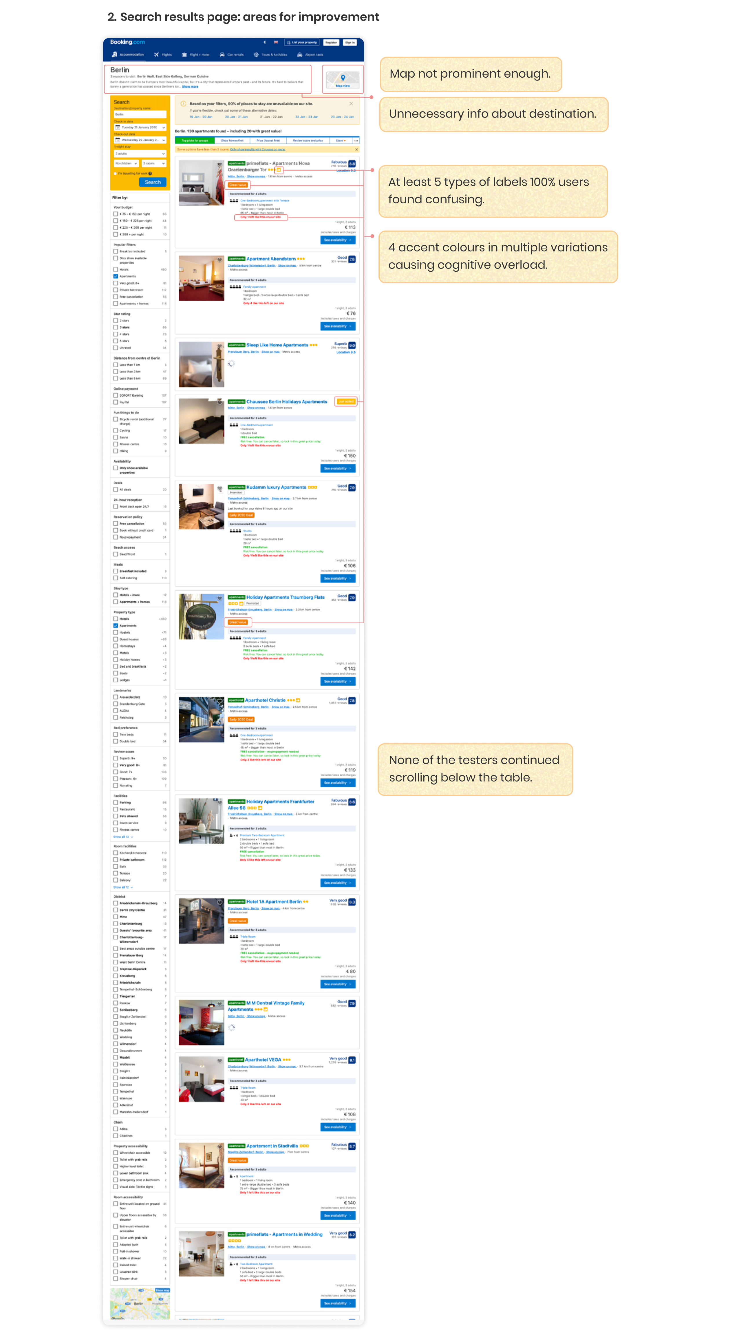 To verify my hypotheses, I first analysed the current state of booking.com desktop and mobile website by conducting its heuristic analysis. I also consulted online reviews of booking.com customers and talked to the customer service employees. The main takeaways were that: